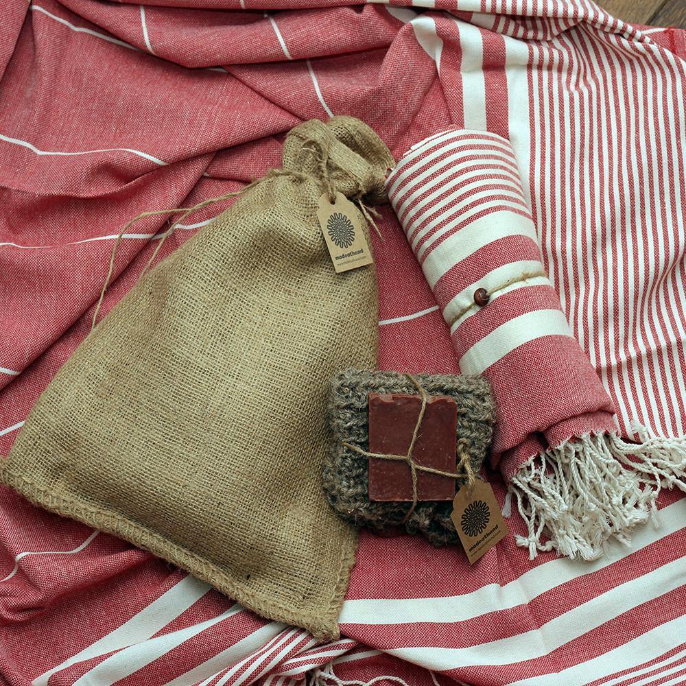 Este set forma parte de nuestra colección de baño y bienestar, y es un regalo perfecto para cualquier ocasión. Hemos reunido lo mejor de la naturaleza —sus propiedades más nutritivas y cuidadoras— y lo hemos envuelto en una bolsa de yute de estilo artesanal. Incluye una toalla hammam tejida a mano, una pastilla de jabón hidratante y un guante exfoliante único.